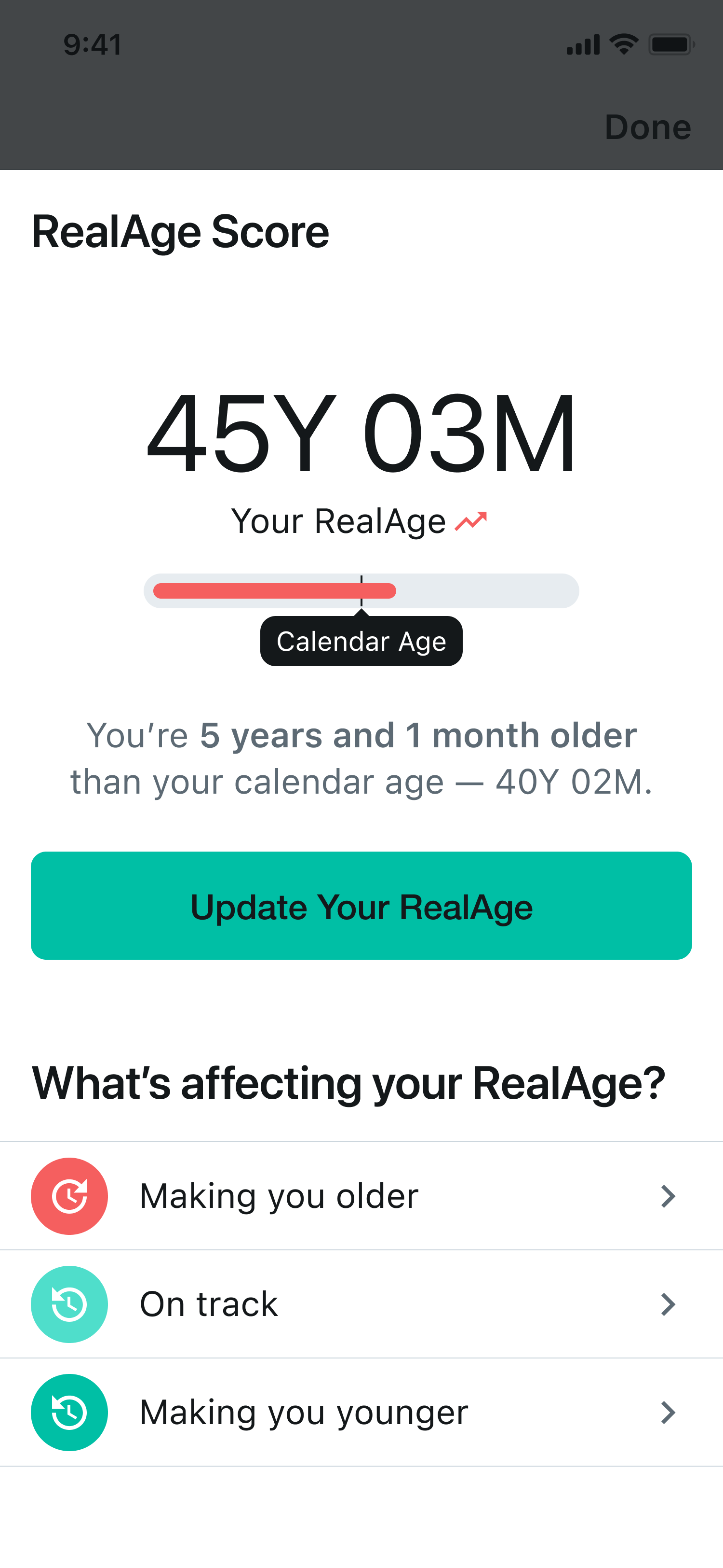 The RealAge Test is a proprietary algorithm that evaluates a person's overall health status based on a range of factors, including lifestyle, medical history, and genetics. Learn more about the RealAge test.